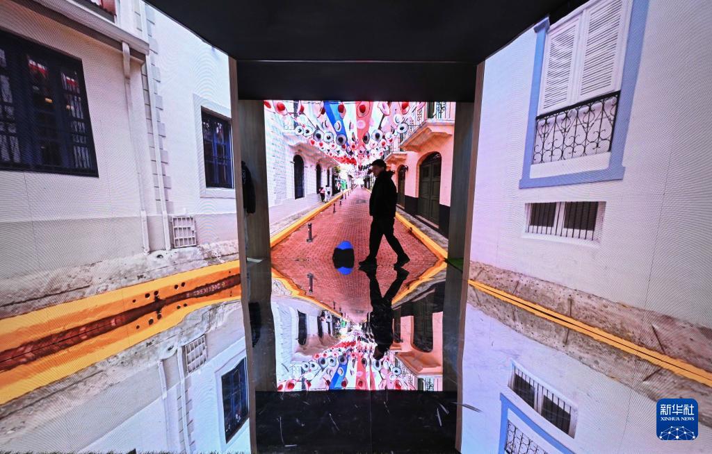 1月21日,在西班牙马德里,参观者从旅游展上一处三维图像展示装置中走过。