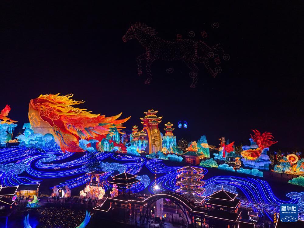 这是1月23日在四川省自贡市中华彩灯大世界拍摄的灯组和无人机表演(无人机照片)。