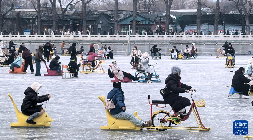 1月25日,市民在什刹海冰场上玩冰上自行车等冰雪娱乐项目。