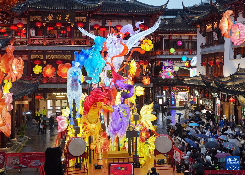 1月26日拍摄的豫园商城中心广场上的马年主题灯组“骏驰九州,步步生花”。