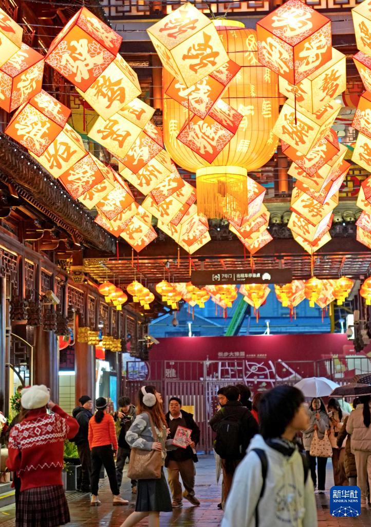 1月26日,豫园灯会上的春联与流光溢彩的花灯营造出新春的喜庆氛围。