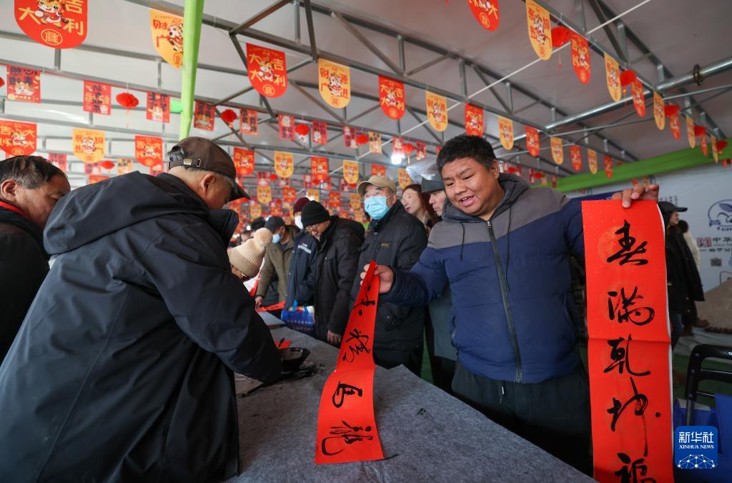 1月26日,市民在天津芦台大集现场领取新春对联。