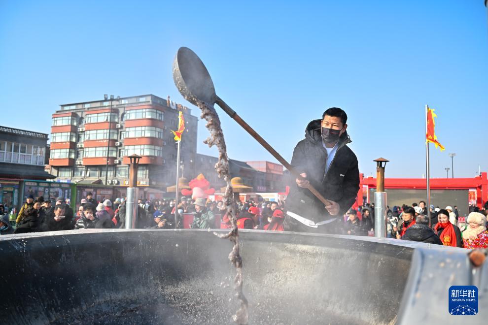 1月26日,在天津芦台大集,工作人员为赶集市民熬制腊八粥。