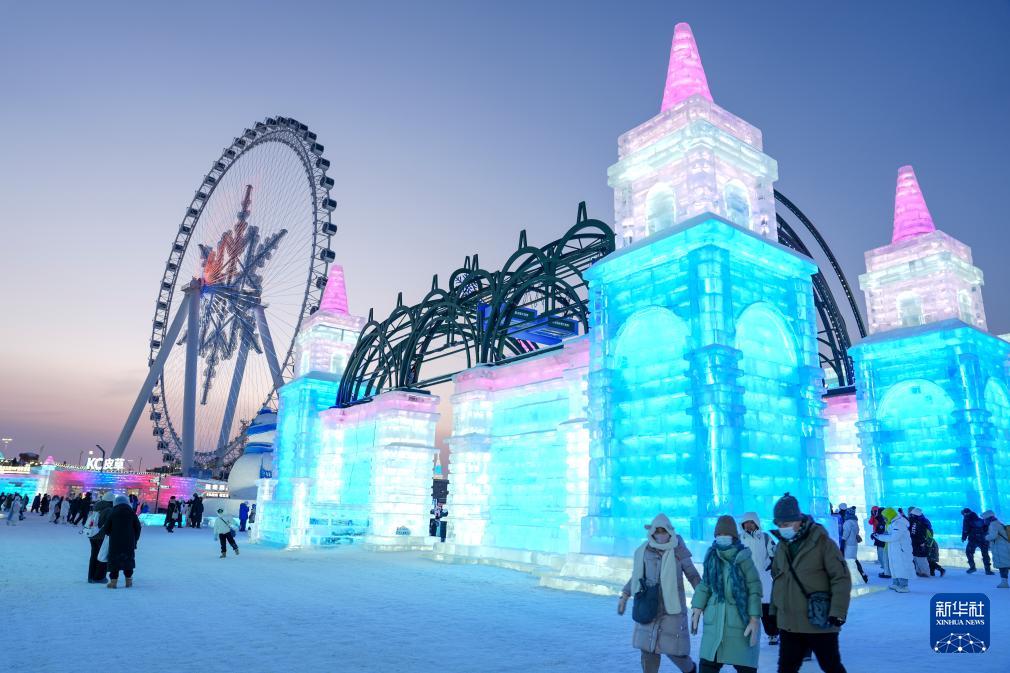 寒冬时节,哈尔滨冰雪大世界园区流光溢彩,吸引了来自天南海北的游客观赏游玩,畅享冰情雪趣。
