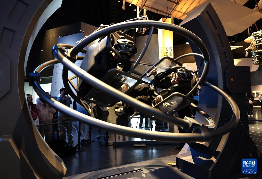 1月27日,参观者在上海科技馆“飞行探秘”展区内体验乘坐四轴平衡器。
