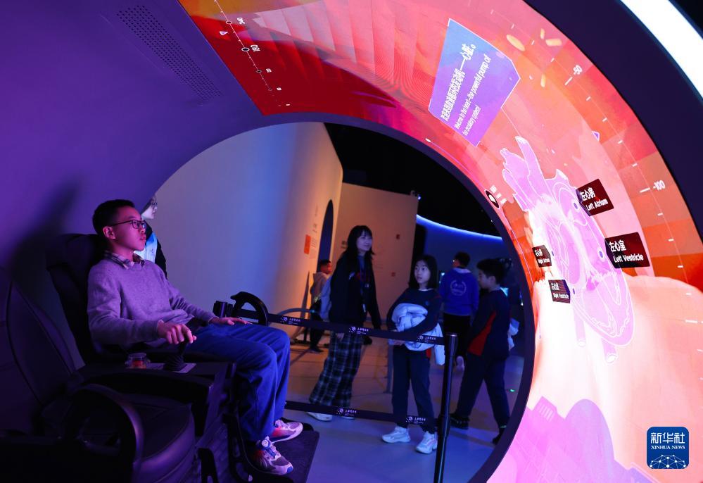 1月27日,参观者在上海科技馆“神奇的我”展区内体验“血管漫游”体感游戏。