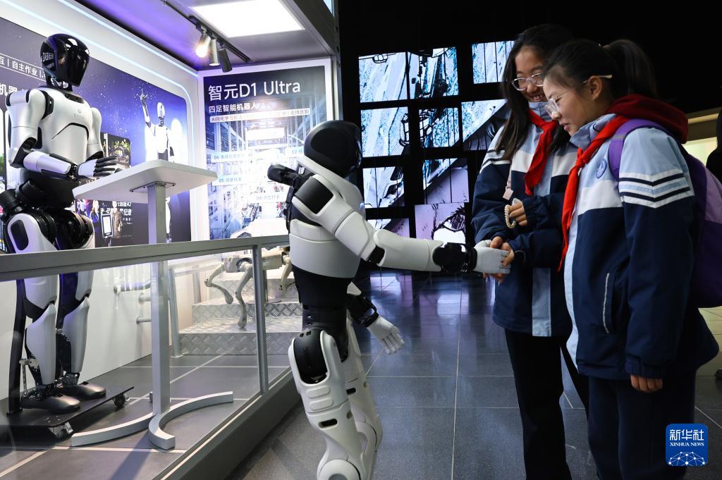 1月27日,参观者在上海科技馆“明日行者”展区内观看机器人表演。