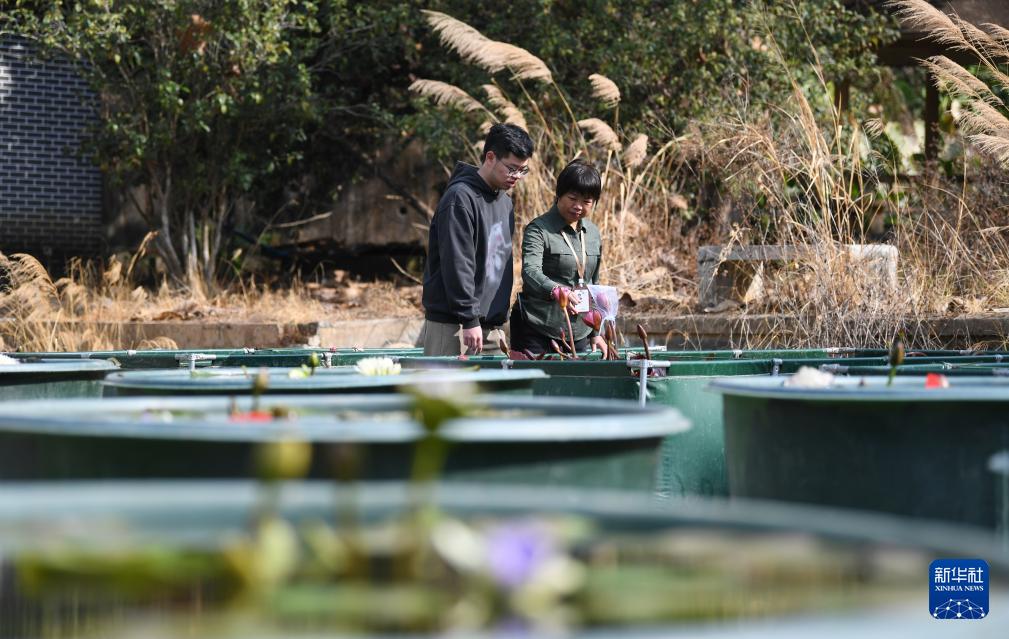 1月27日,在广州云溪植物园资源圃,睡莲引种保育开发小组成员查看睡莲长势。