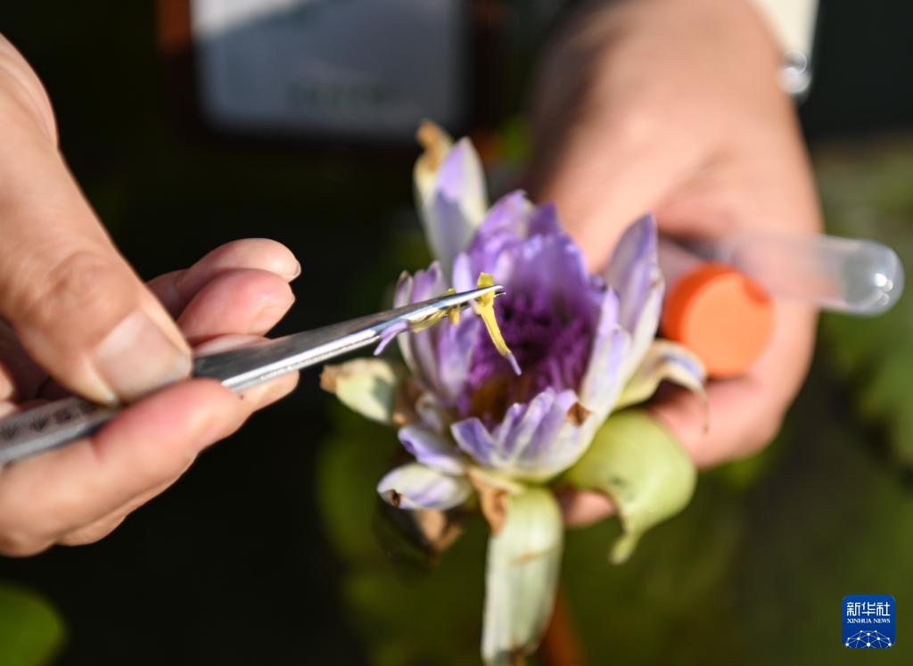 1月27日,在广州云溪植物园资源圃,睡莲引种保育开发小组成员庞洁瑜对睡莲进行人工授粉。