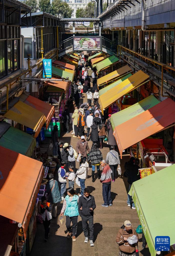 1月27日,人们在昆明大观篆新农贸市场内游览、购物。