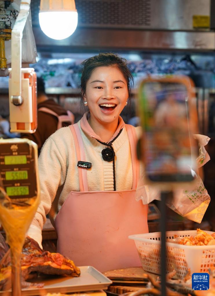 1月27日,人们在昆明大观篆新农贸市场内一边游览一边品尝特色美食。