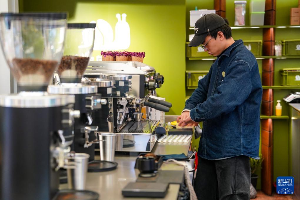 1月27日,在昆明大观篆新农贸市场的一家咖啡店里,咖啡师在制作咖啡。