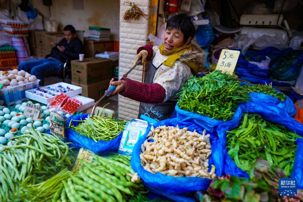 1月27日,一名摊主在昆明大观篆新农贸市场内给蔬菜洒水保鲜。