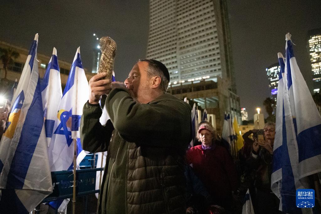 1月27日,在以色列特拉维夫一处广场,人们参加计时牌关闭活动时吹响羊角号。