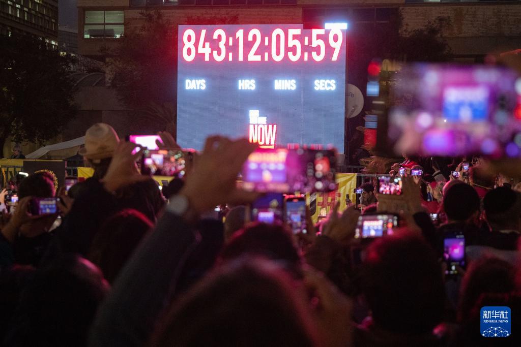 1月27日,在以色列特拉维夫一处广场,人们参加计时牌关闭活动。