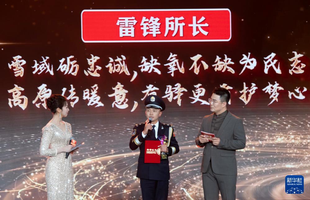 1月28日,由新华社主办的“中国网事·感动2025”公益盛典暨年度颁奖典礼在北京举行,活动揭晓“中国网事·感动2025”十大年度网络人物。这是“雷锋所长”刘鹏(中)出席颁奖典礼。新华社记者 李安 摄