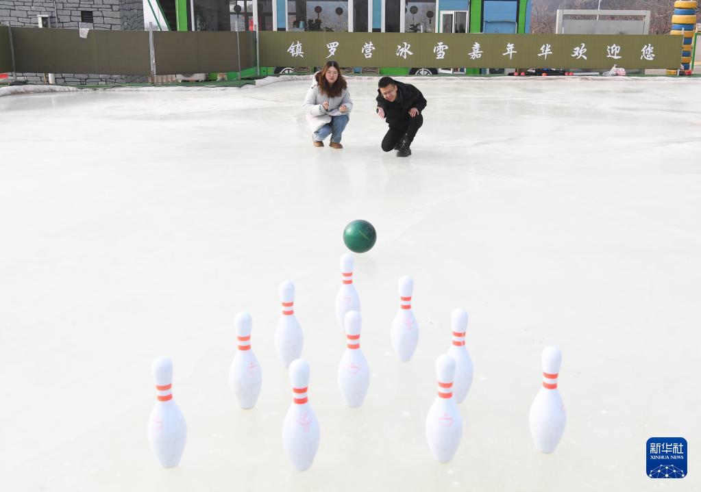 1月28日,在北京市平谷区镇罗营镇湖畔耕读园,游客在活动现场体验“冰上保龄球”。