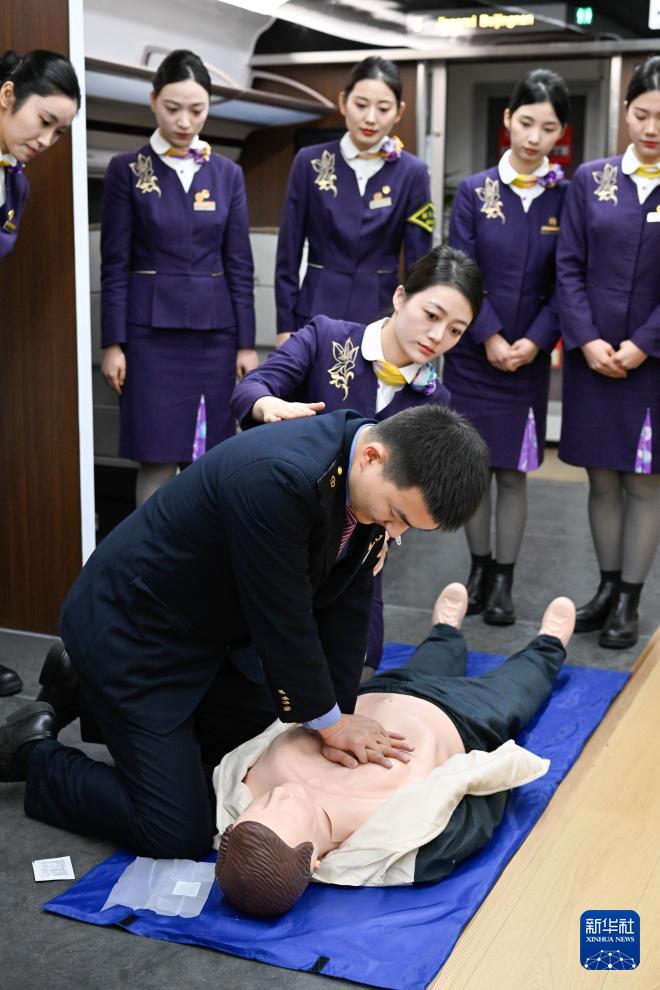 1月28日,中国铁路上海局集团有限公司南京客运段高铁二车队乘务人员进行急救演练。