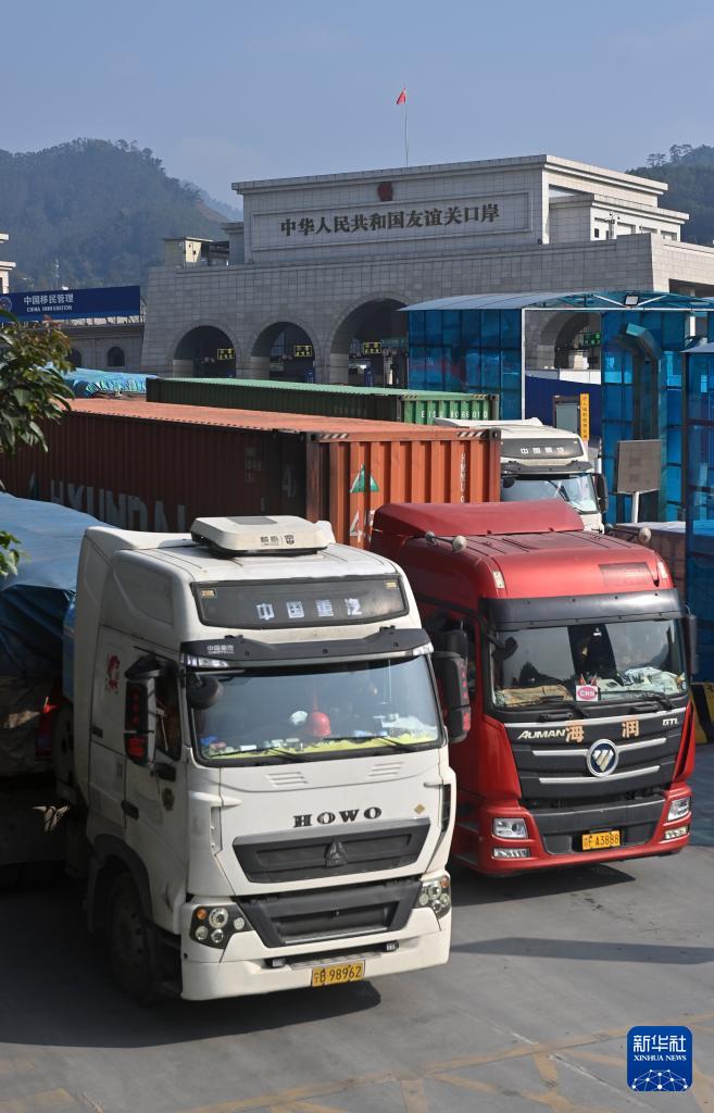 1月28日,在位于广西凭祥的友谊关口岸,通关后的车辆准备驶往越南。