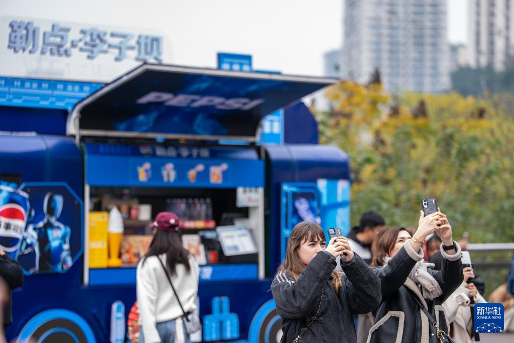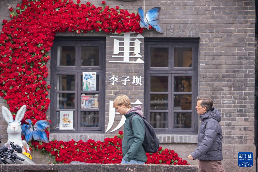 外籍游客在重庆市渝中区李子坝游玩(1月7日摄)。