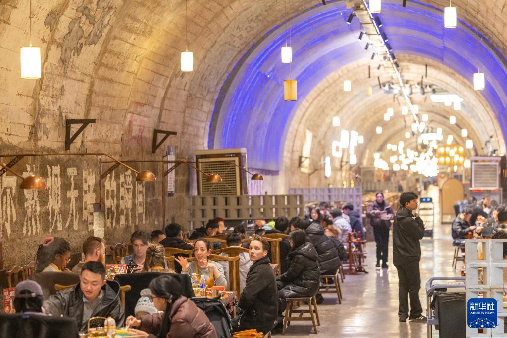 在重庆市两江新区,外籍人员在防空洞内品尝重庆火锅(1月24日摄)。