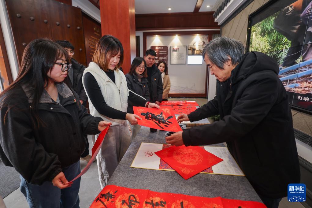 1月28日,在嘉兴市南湖区新丰镇的学稼公社内,书法老师现场书写廉洁主题春联与“廉”字,送给前来参观学习的党员。