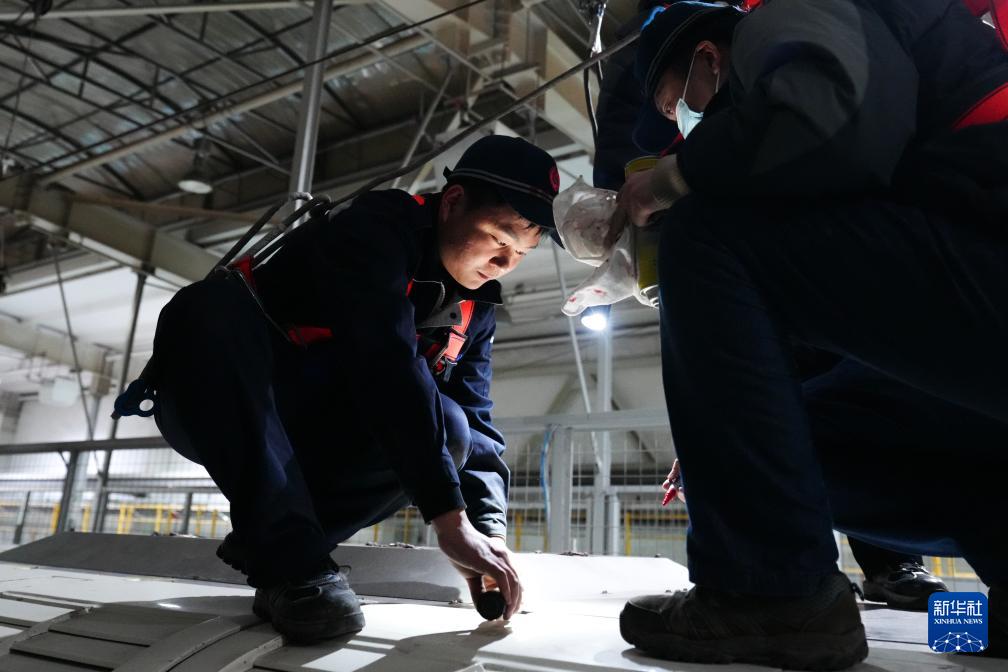 1月27日,中国铁路青藏集团有限公司西宁车辆段动车运用车间工作人员李金石(左)、杨勤雪在检查转向架。