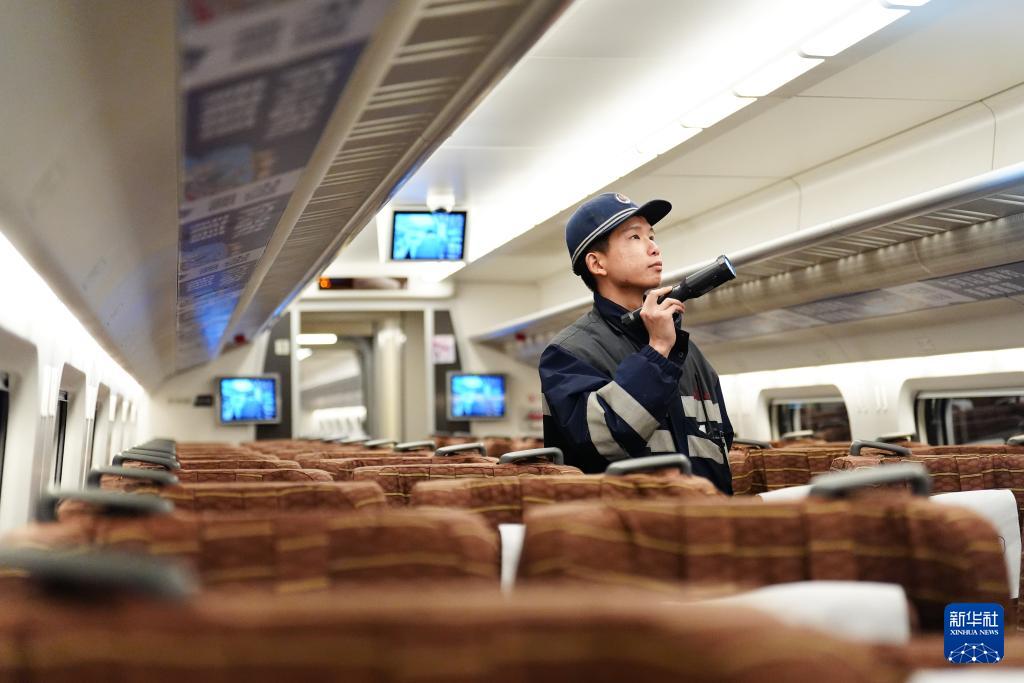 1月27日,中国铁路青藏集团有限公司西宁车辆段动车运用车间工作人员黄思豪在检查车内上部服务设施。