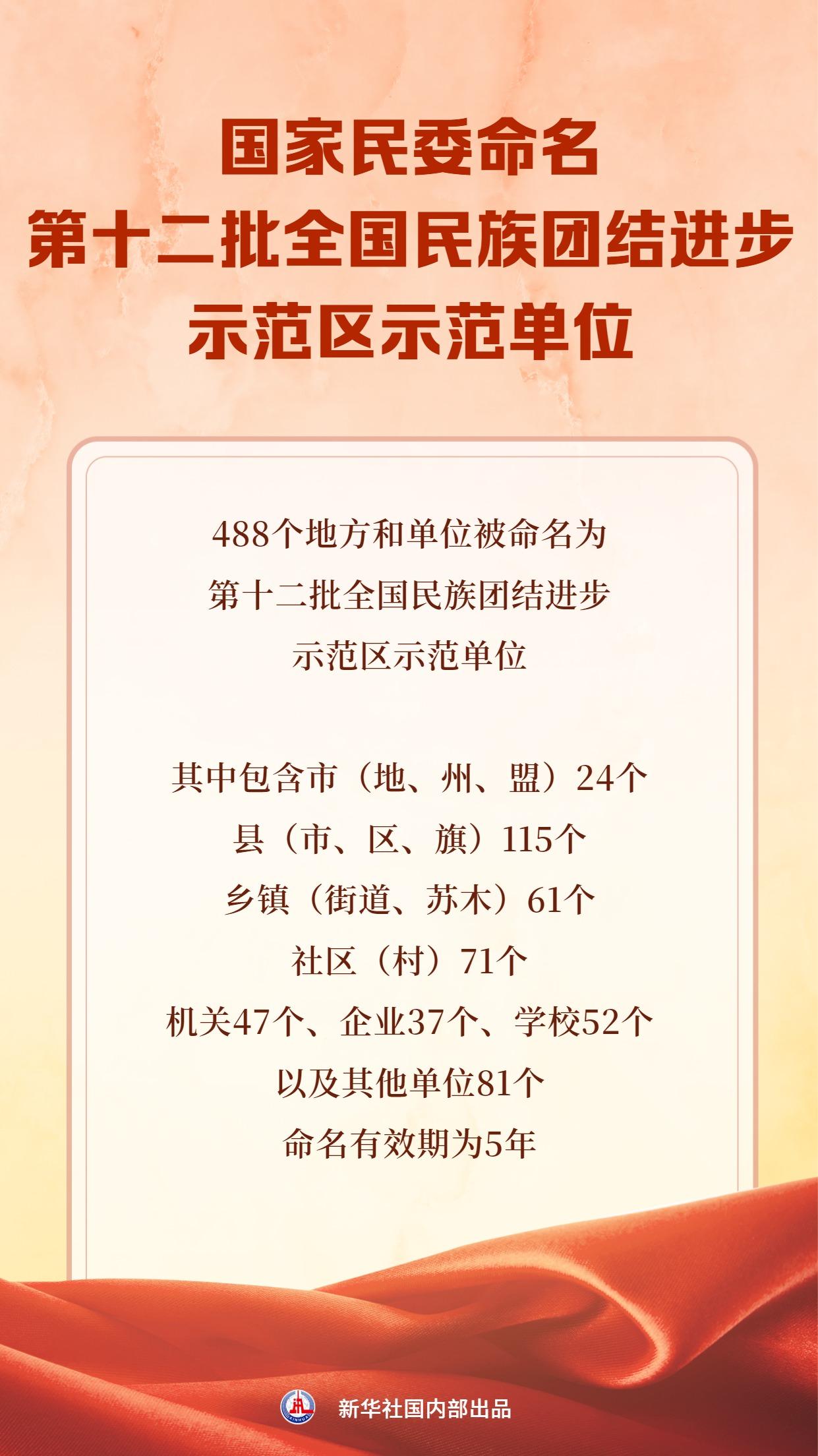 记者从1月29日在京召开的全国民委主任会议获悉,488个地方和单位被命名为第十二批全国民族团结进步示范区示范单位。