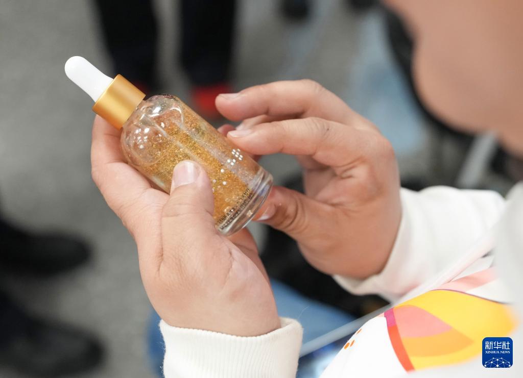 1月29日,在中国残联2026年迎新春中外交流活动上,一名视障嘉宾通过“阅读”盲文了解一款化妆品。