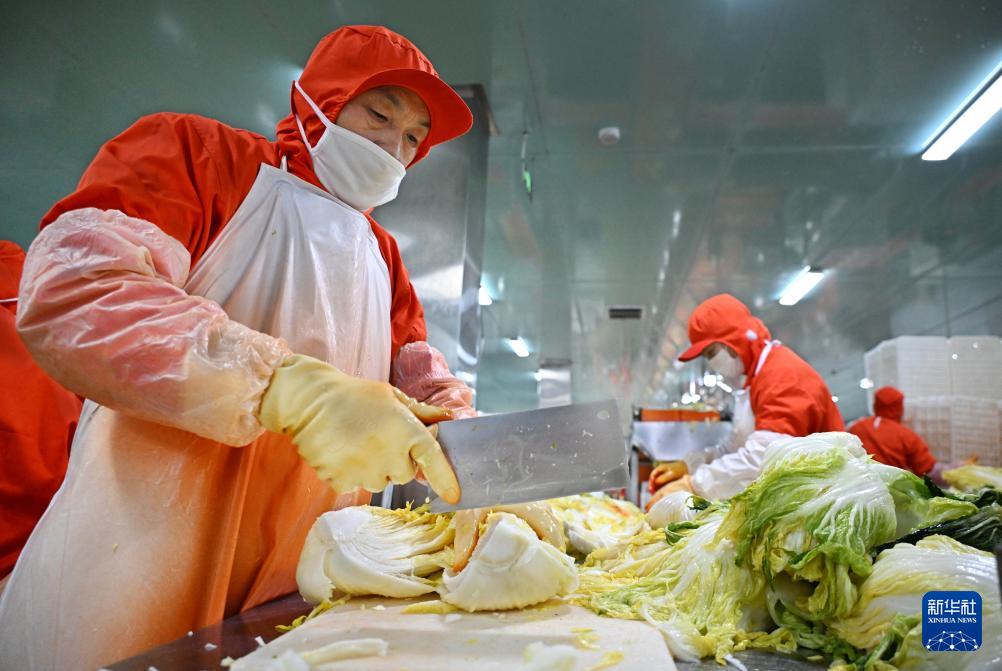 1月29日,青岛农一食品有限公司员工在加工泡菜。