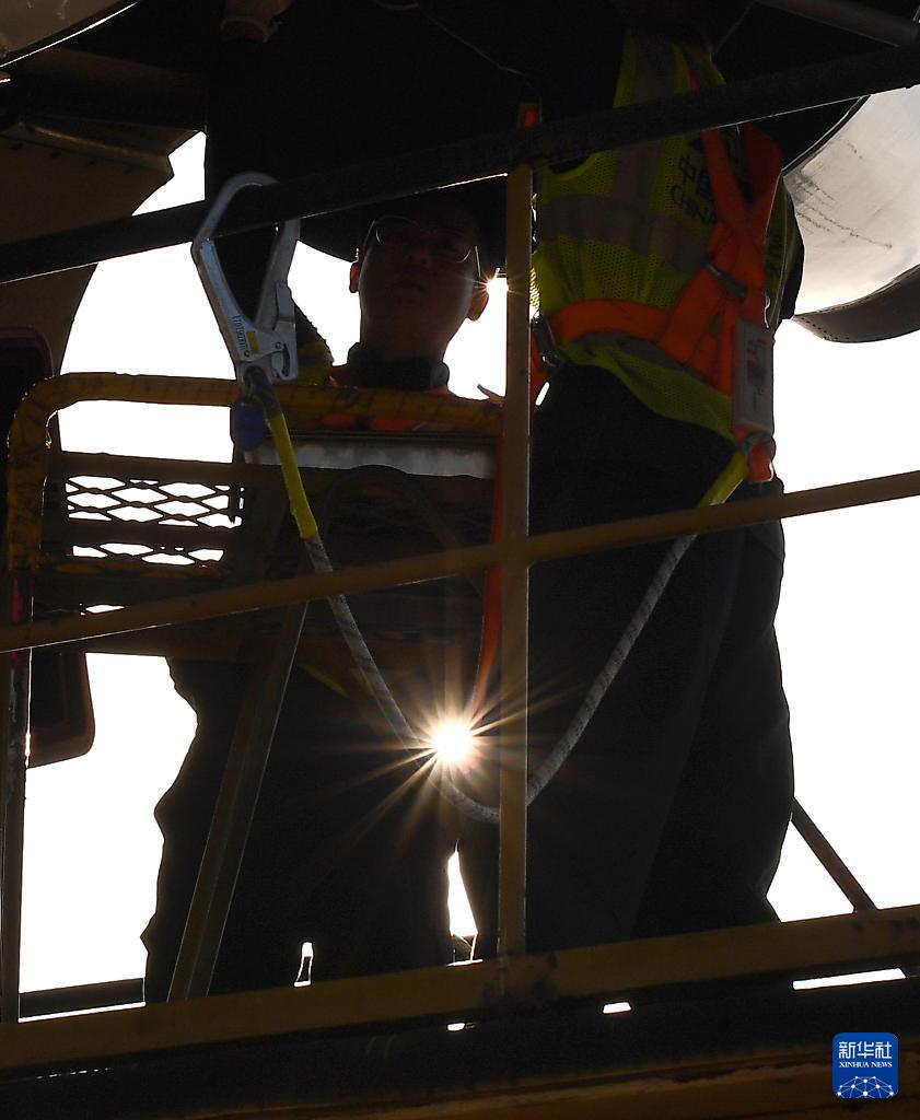 1月29日,海口美兰国际机场停机坪上,南航工程技术分公司机务工程师在对飞机进行深度检查。