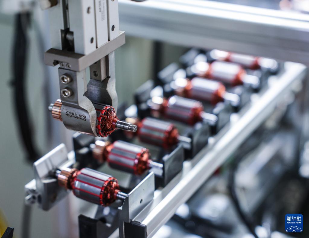 1月29日,在位于金华市金东区的金顺工具有限公司车间内,自动化流水线上在生产电机定子。该公司是一家从事喷枪、喷涂机等喷涂技术与产品研发、制造和销售的国家高新技术企业、国家专精特新“小巨人”企业,产品出口销往欧美97个国家和地区,授权专利197项。