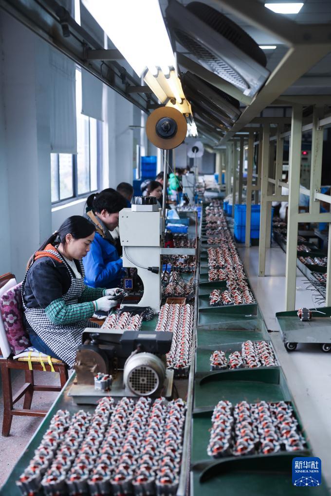 1月29日,在位于金华市金东区的金顺工具有限公司车间内,流水线上在生产电机定子。该公司是一家从事喷枪、喷涂机等喷涂技术与产品研发、制造和销售的国家高新技术企业、国家专精特新“小巨人”企业,产品出口销往欧美97个国家和地区,授权专利197项。