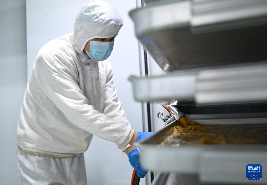 1月27日,在河南濮阳县的中国(濮阳)埃塞咖啡产业示范园冻干车间,工作人员利用喷枪向盘内注入成品咖啡液,准备冷冻。