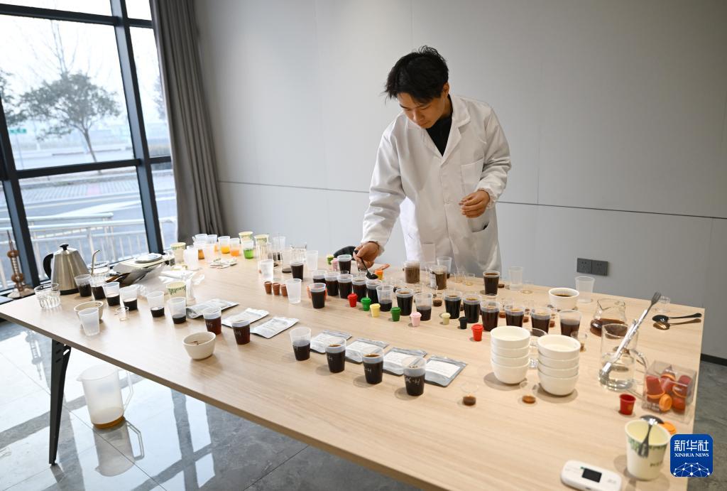 1月27日,在河南濮阳县的中国(濮阳)埃塞咖啡产业示范园,研发人员在进行咖啡杯测。
