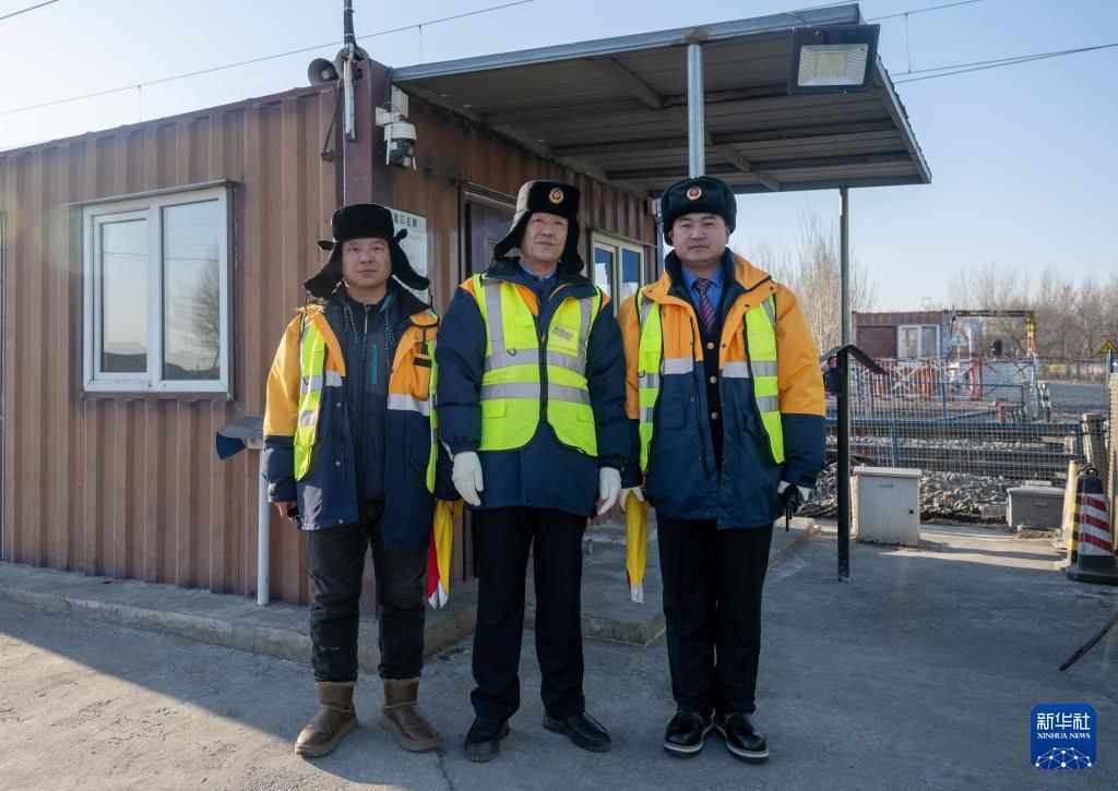 2月1日,通让线27公里道口工长徐中成(左二)与工人彭博(左一)、张浩在道口值班室前合影。