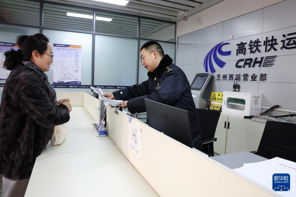 2月1日,中铁快运兰州西站营业部工作人员孙谦(右)为旅客董文琦办理宠物托运手续。