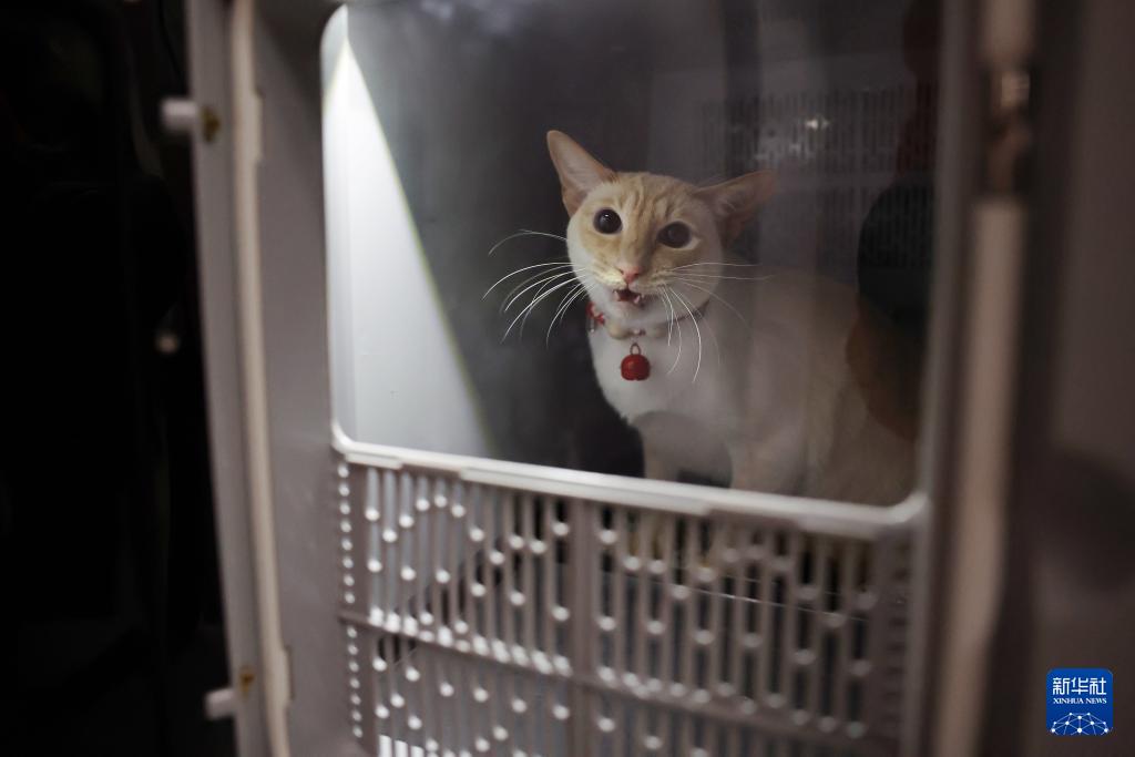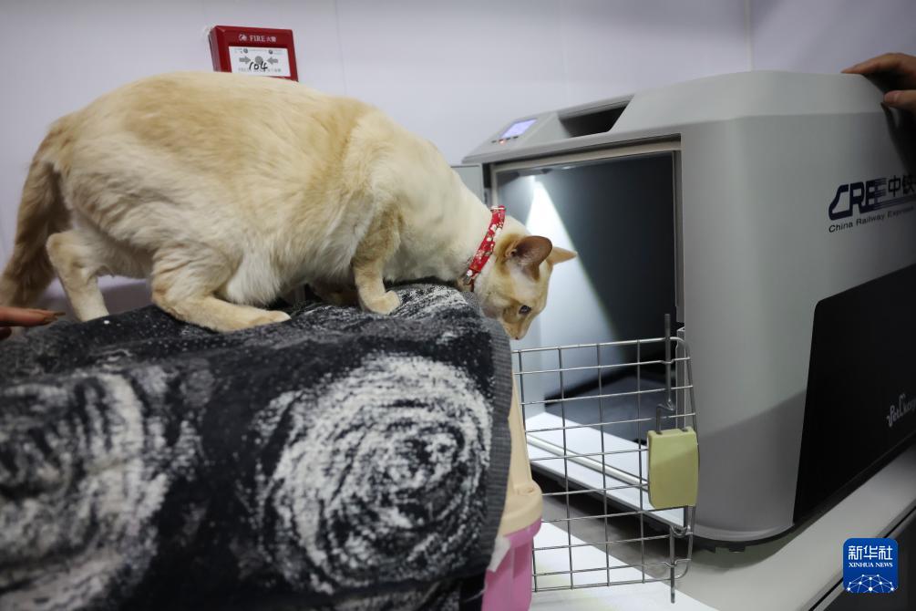 2月1日,在中铁快运兰州西站营业部宠物交接区,一只小猫准备进入高铁宠物运输专用箱。