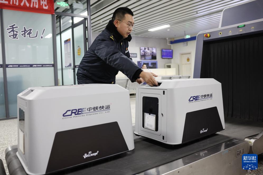 2月1日,中铁快运兰州西站营业部工作人员孙谦将旅客托运的宠物放在安检仪上准备进行安检。