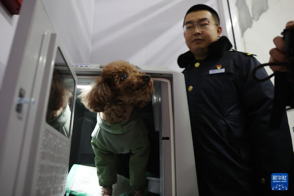 2月1日,在中铁快运兰州西站营业部,旅客托运的宠物在进行安检。