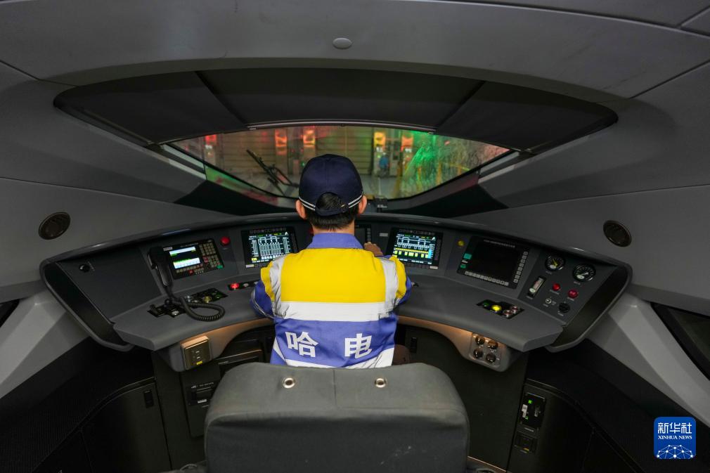 在中国铁路哈尔滨局集团有限公司哈尔滨动车段检修库,电务段信号工人在驾驶室内对动车组ATP列车超速自动防护系统进行检测作业,观察显示设备对速度和制动命令的响应情况(1月31日摄)。