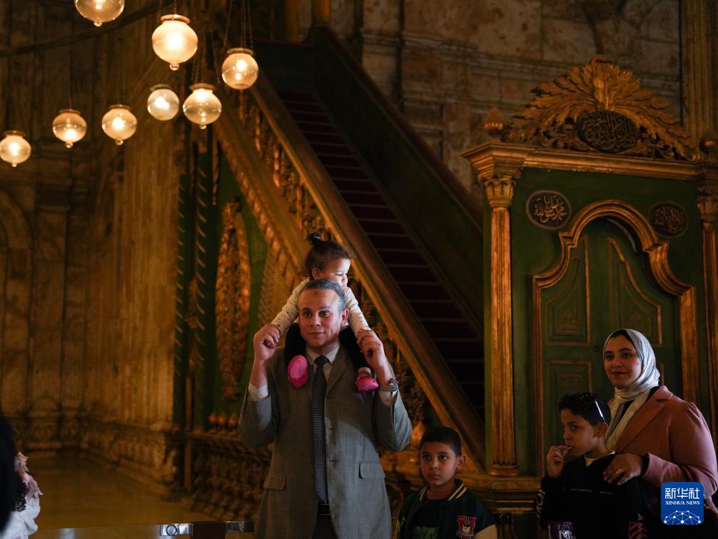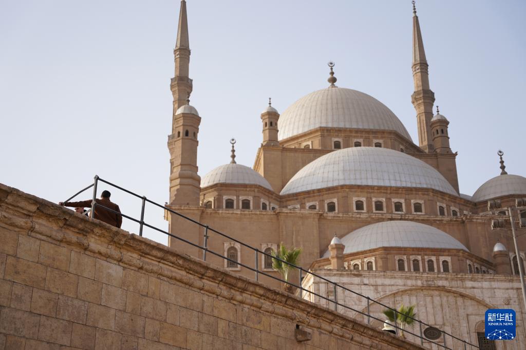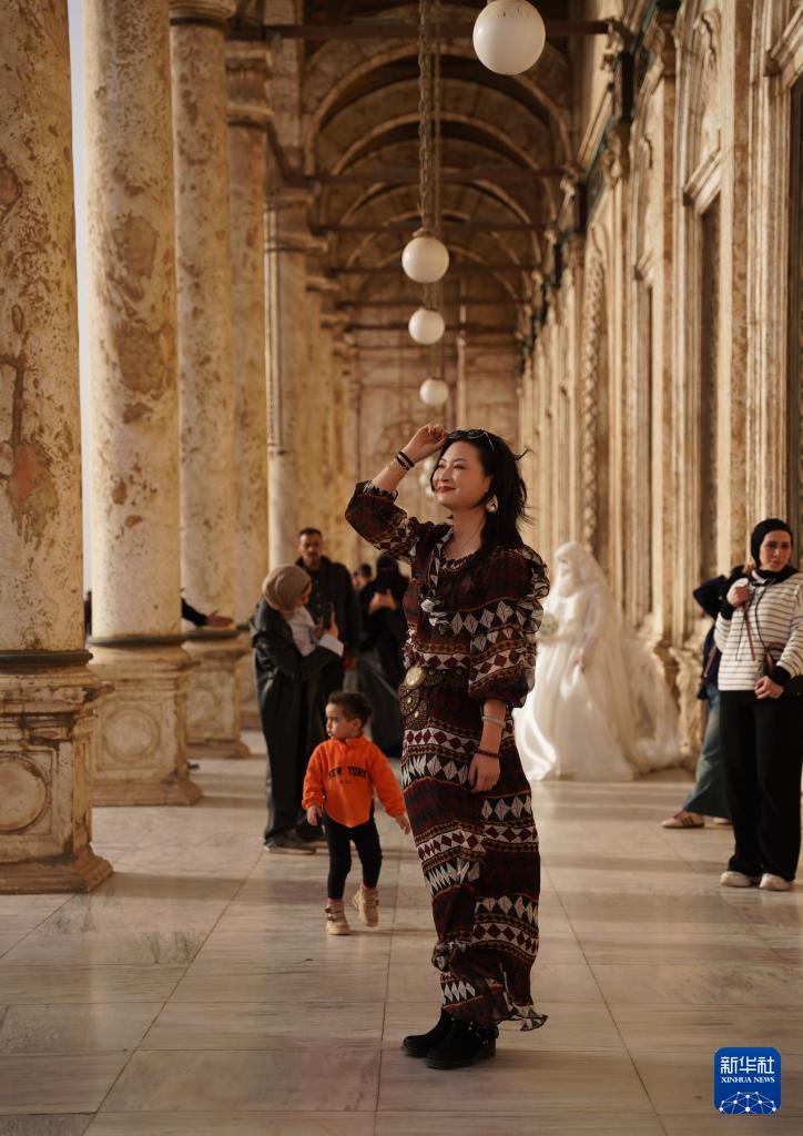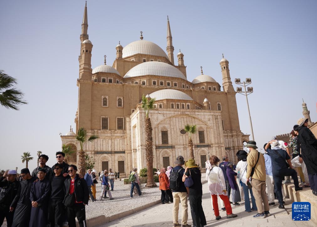 1月30日,游客在埃及开罗萨拉丁城堡内的穆罕默德·阿里清真寺前游览、合影。