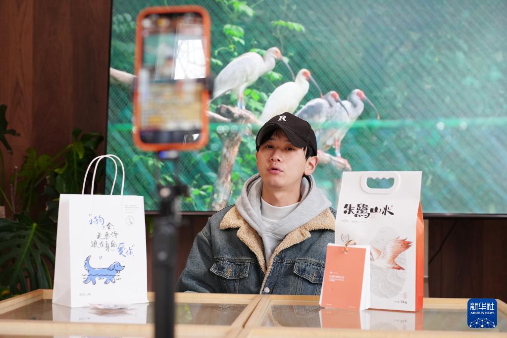 1月22日,在安康市宁陕县城关镇渔湾村的朱鹮博物馆内,工作人员周智天在直播销售村里的农产品。