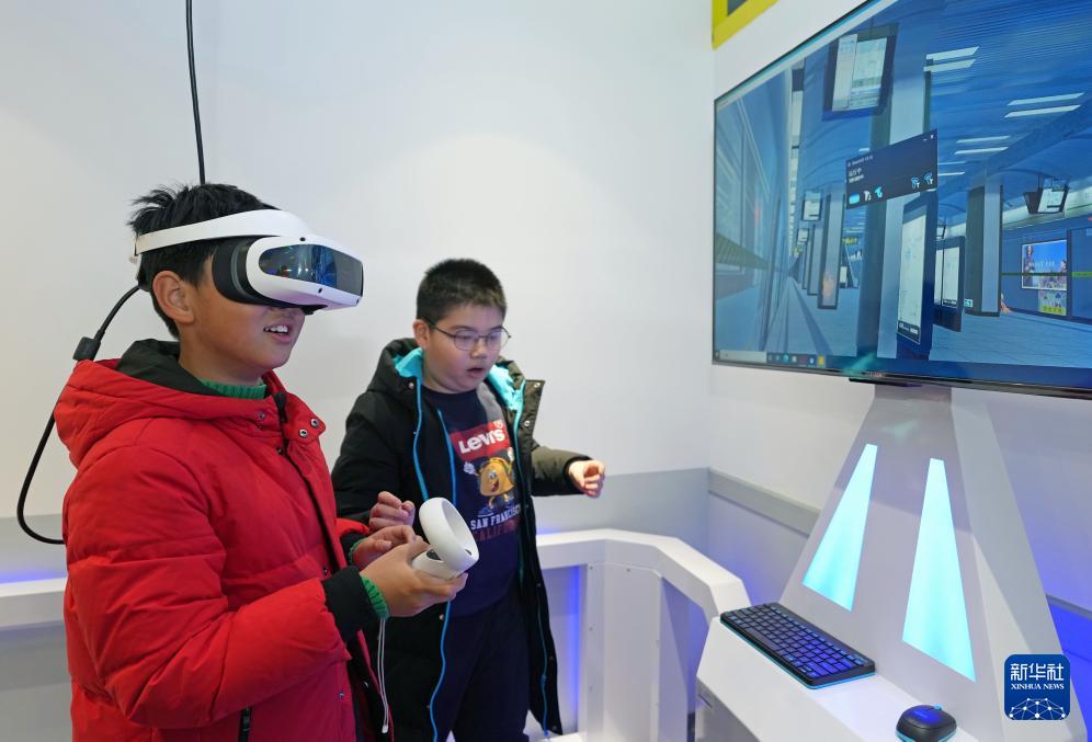 2月2日,在上海市普陀区长征镇办班点,寒托班的小学生通过VR安全模拟学习地铁火灾逃生技能。