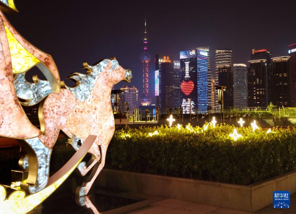 2月1日晚,BFC外滩金融中心露台上的骏马造型花灯与浦江夜景相辉映。