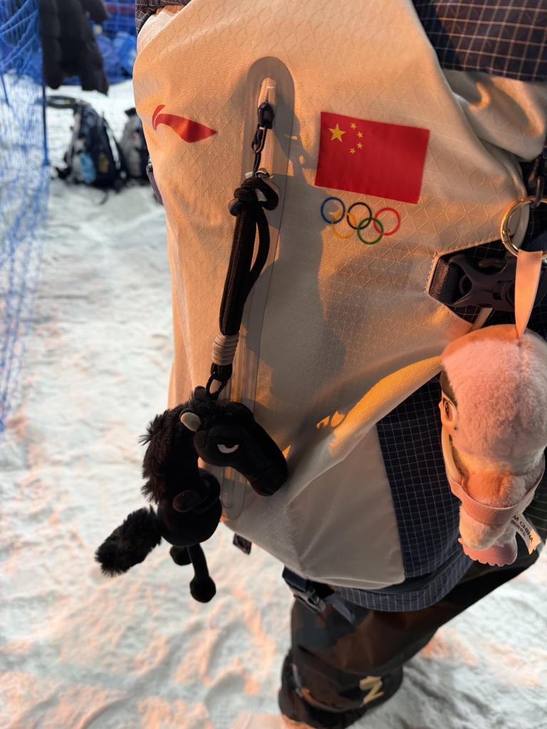 张小楠是此次中国队参加单板滑雪大跳台的唯一女选手,她在背包上挂了一个颇有巧思的挂件——一匹小黑马。“这是我的教练送给我的,我觉得很有意义。”