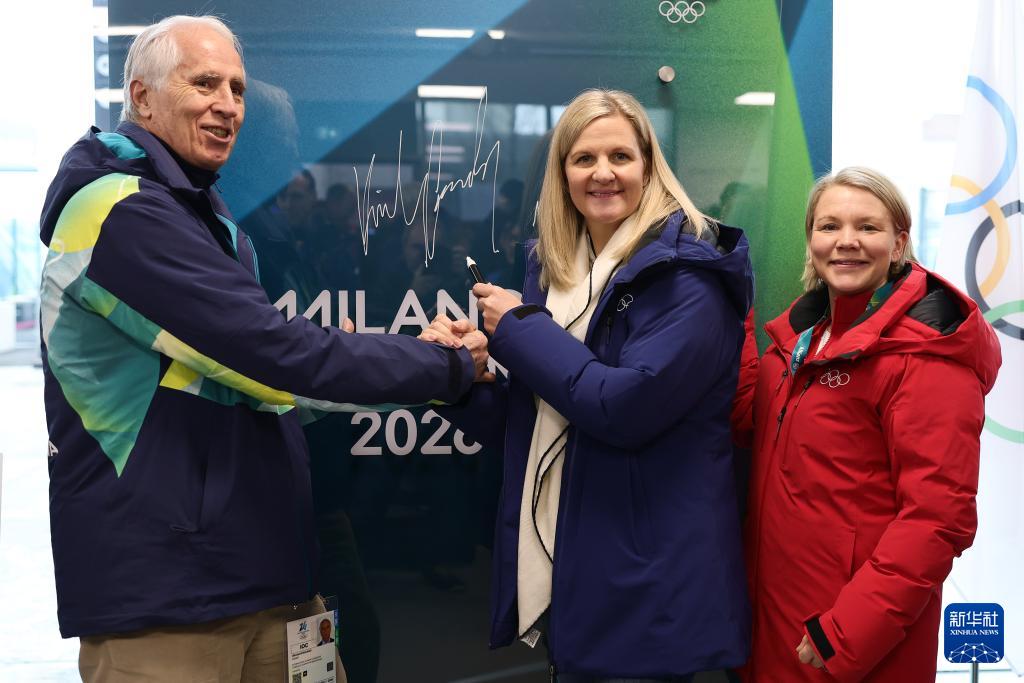 2月2日,国际奥委会主席考文垂(中)、米兰-科尔蒂纳冬奥会组委会主席乔瓦尼·马拉戈(左)和国际奥委会运动员委员会主席泰尔霍在揭幕活动现场合影。