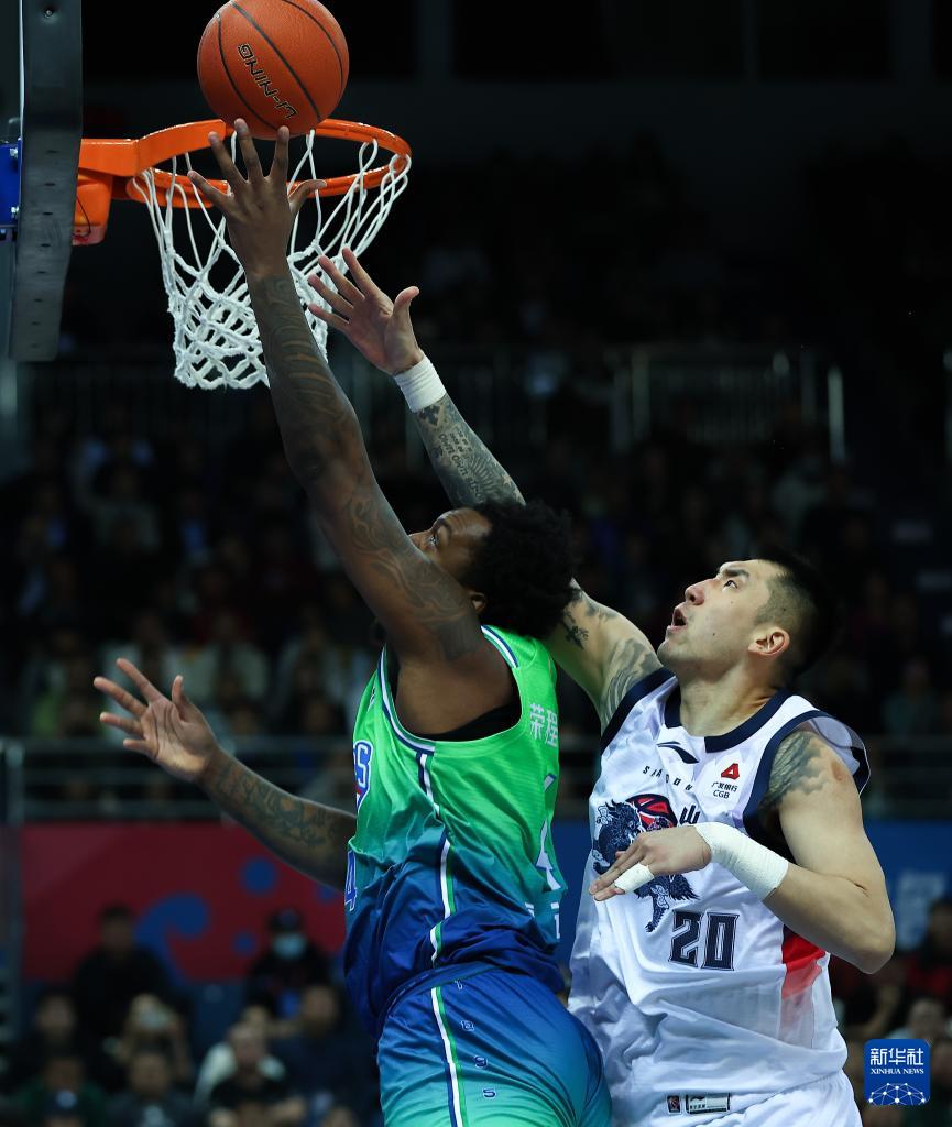 2月2日,山东高速队球员鲍威尔(右)与天津先行者队球员赖俊豪在比赛中。