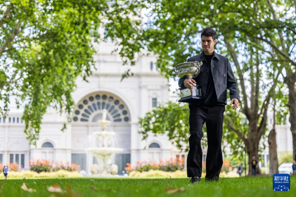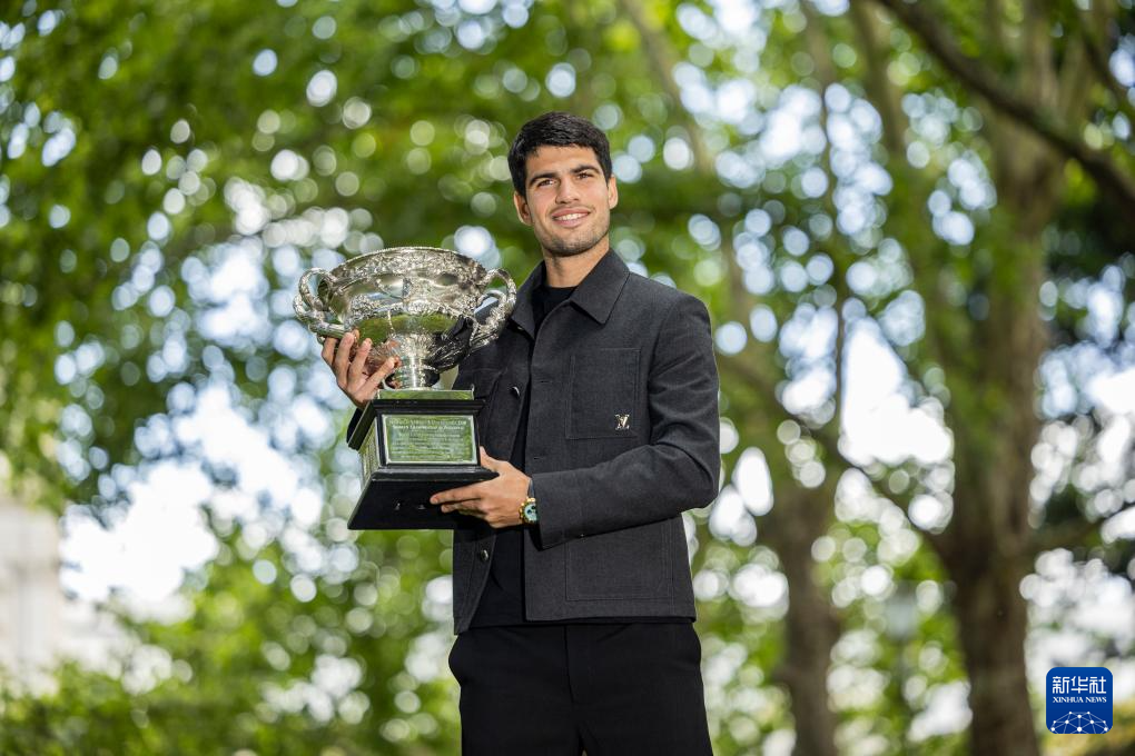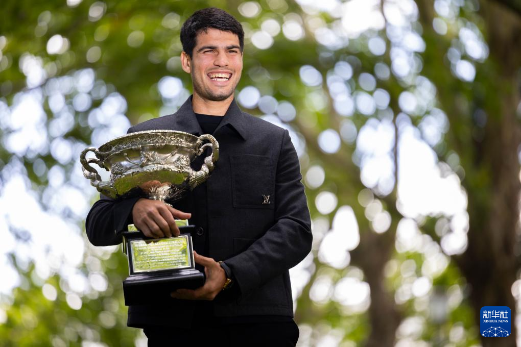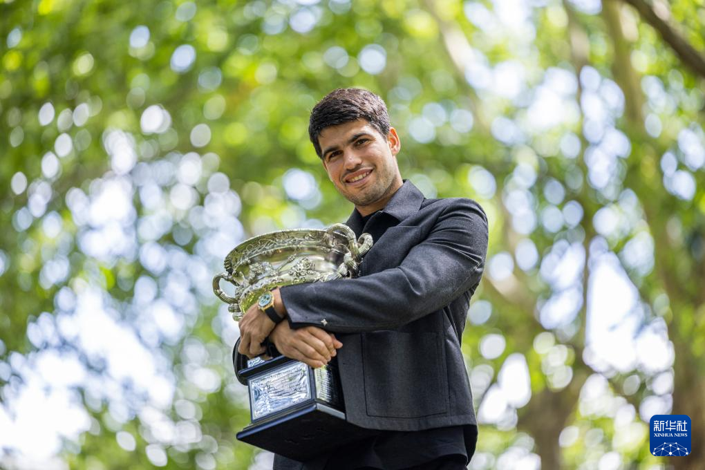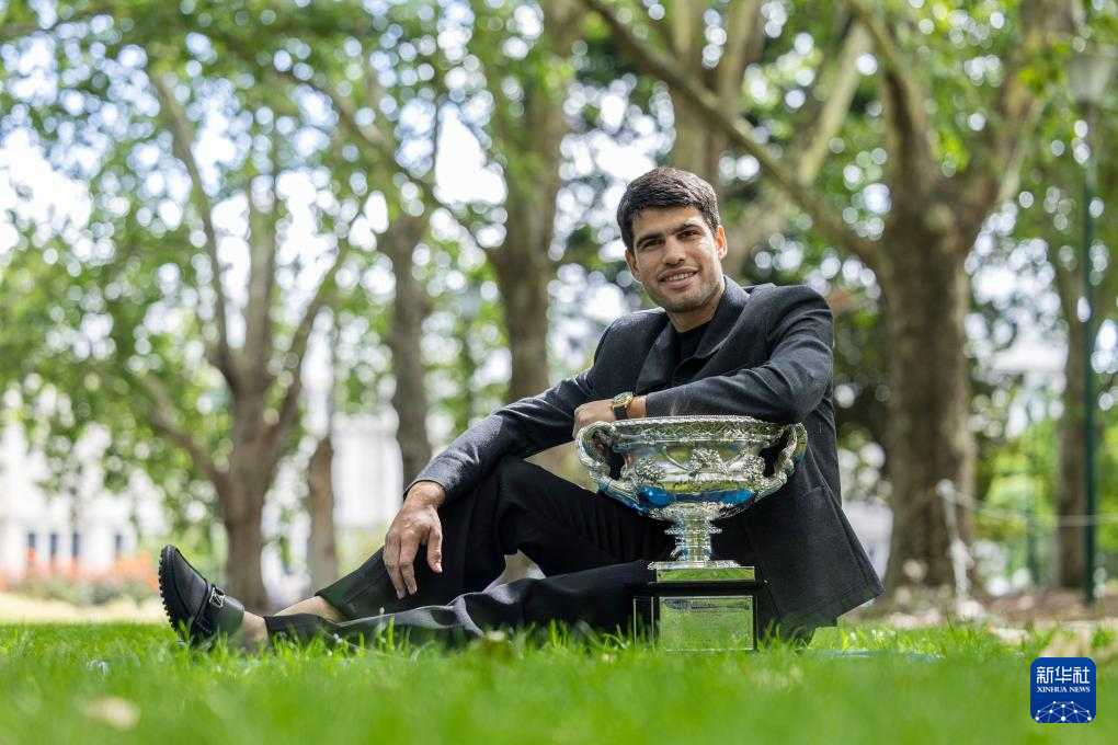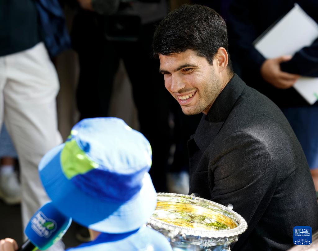 2月2日,媒体采访拍摄阿尔卡拉斯展示冠军奖杯。